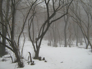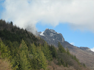 I started off on the path that Mum and I took last summer, following the signs for the 3 Alpi. After the first alp, however, I left that path and headed steeply up hill on the walker's path to the Corni di Canzo. (There are two paths, but one of them involves a via ferrata, and it wasn't the day for experimenting with that.) As well as being over optimistic about the weather, I was hoping to do the 5 hour walk in 4 hours in order to catch the train back to Milan in time for aperitivo with my former colleagues, so I pushed myself hard to get up the mountain in the snow in record time. As a result, I was slightly breathless and this, combined with being surrounded by bare black trees, fog and a thick blanket of snow, contributed to a very other-worldly impression. I did want to arrive “somewhere” before going back down the mountain, however, so I struggled onwards and upwards, stopping every so often to try to figure out how far I had gone and whether I was going to make it or not, which was tricky given the snow underfoot and the total lack of visibility.