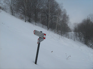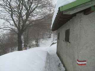 I started off on the path that Mum and I took last summer, following the signs for the 3 Alpi. After the first alp, however, I left that path and headed steeply up hill on the walker's path to the Corni di Canzo. (There are two paths, but one of them involves a via ferrata, and it wasn't the day for experimenting with that.) As well as being over optimistic about the weather, I was hoping to do the 5 hour walk in 4 hours in order to catch the train back to Milan in time for aperitivo with my former colleagues, so I pushed myself hard to get up the mountain in the snow in record time. As a result, I was slightly breathless and this, combined with being surrounded by bare black trees, fog and a thick blanket of snow, contributed to a very other-worldly impression. I did want to arrive “somewhere” before going back down the mountain, however, so I struggled onwards and upwards, stopping every so often to try to figure out how far I had gone and whether I was going to make it or not, which was tricky given the snow underfoot and the total lack of visibility.